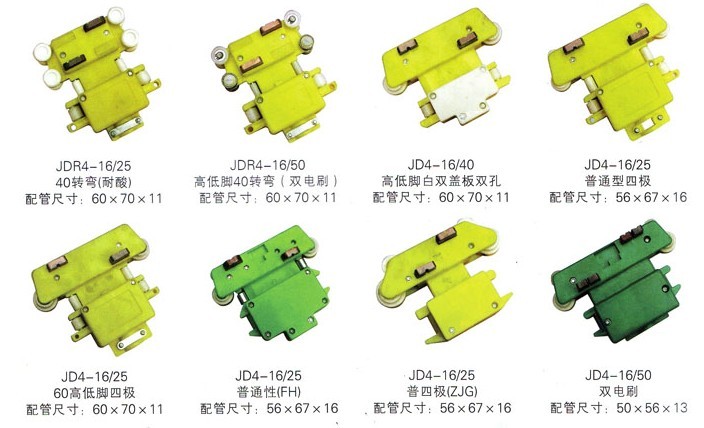 JD系列滑觸線集電器是滑線系統(tǒng)中最主要的部件之一。集電器是滑觸線系統(tǒng)中集電側拾取電能的主要裝置,滑觸線集電器通過集電刷與導軌的滑動接觸,將電能直接傳導至用電器,從而實現(xiàn)系統(tǒng)的移動供電。集電器由機械結構的張力裝置和直接與導軌滑動接觸的集電刷兩部分組成。