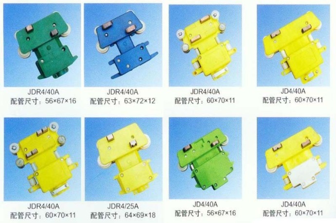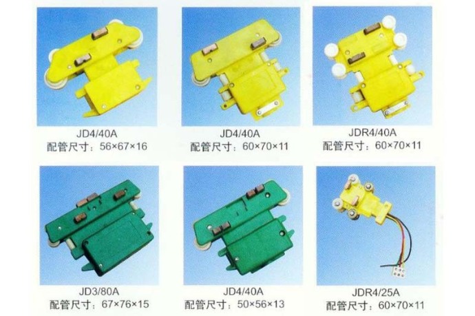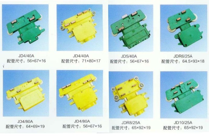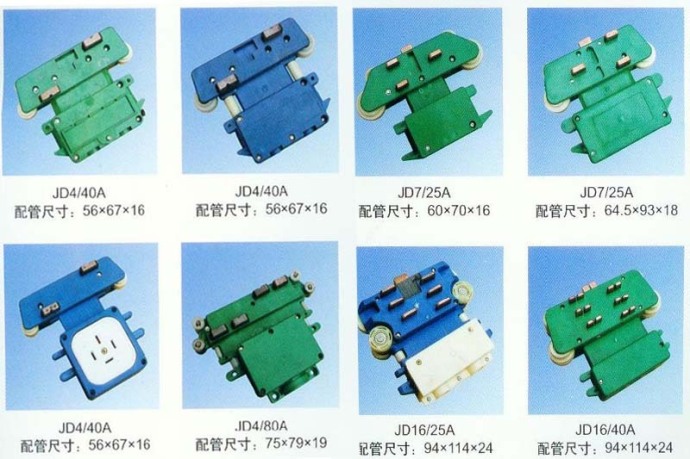 JD系列多極集電器:大三極、雙電刷、普通轉彎、轉彎、大頭雙電刷、高低腳轉彎、高低腳、多極滑觸線集電器普通型四極、高低腳四極、普通型、普四極ZJG、小雙電刷、五極、四極、雙蓋雙孔、六極轉彎、小七極管、大七極管、八極轉彎、十極管、十六極、防塵雙電刷、大四極、四線插座多極滑觸線集電器。